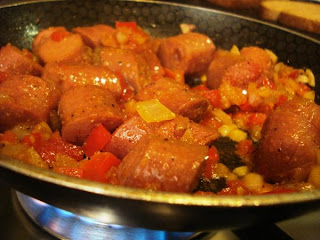 ثم نضيف النقانق بعد التقطيع .. ونتركها تطبخ دقيقتين ونضيف الجبن .