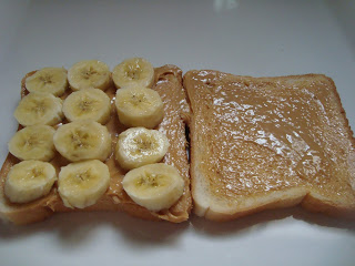 نسوي ساندويتش عادي، ندهن التوست بزبدة الفول السوداني و فوقه نصف شرايح موز