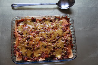 تصف في صينية خبز حتى تنتهي الكميه ، يوضع عليها صلصلة الطماطم التي أعددناها وآخيرا رشه من جبن الشيدر