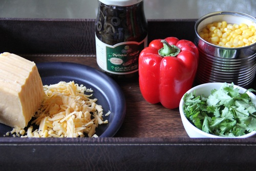 في وعاء نضع الذرة ، الزيتون ، الكزبرة ،وآخيرا الدجاج ونقلب