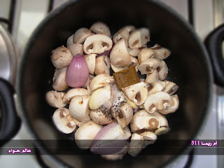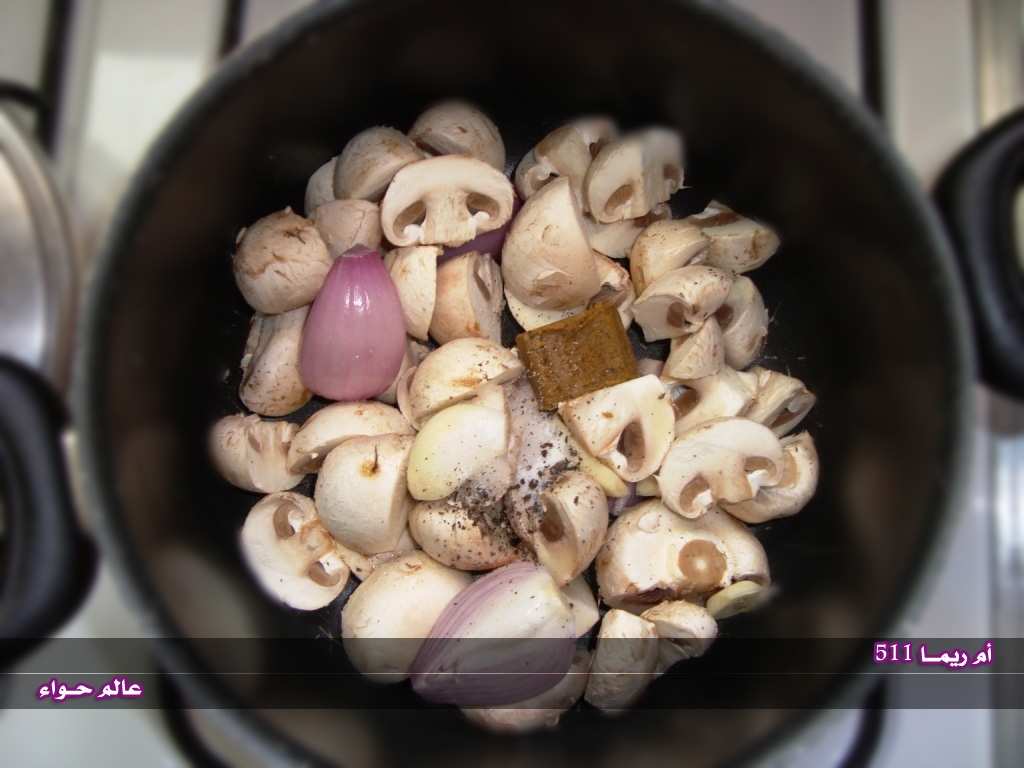 نمسح الفطر بفوطه مبلله بمويه نقطع الفطر شرايح والثوم والبصل ونصب عليه مويه مغليه ونتركه يطبخ ..