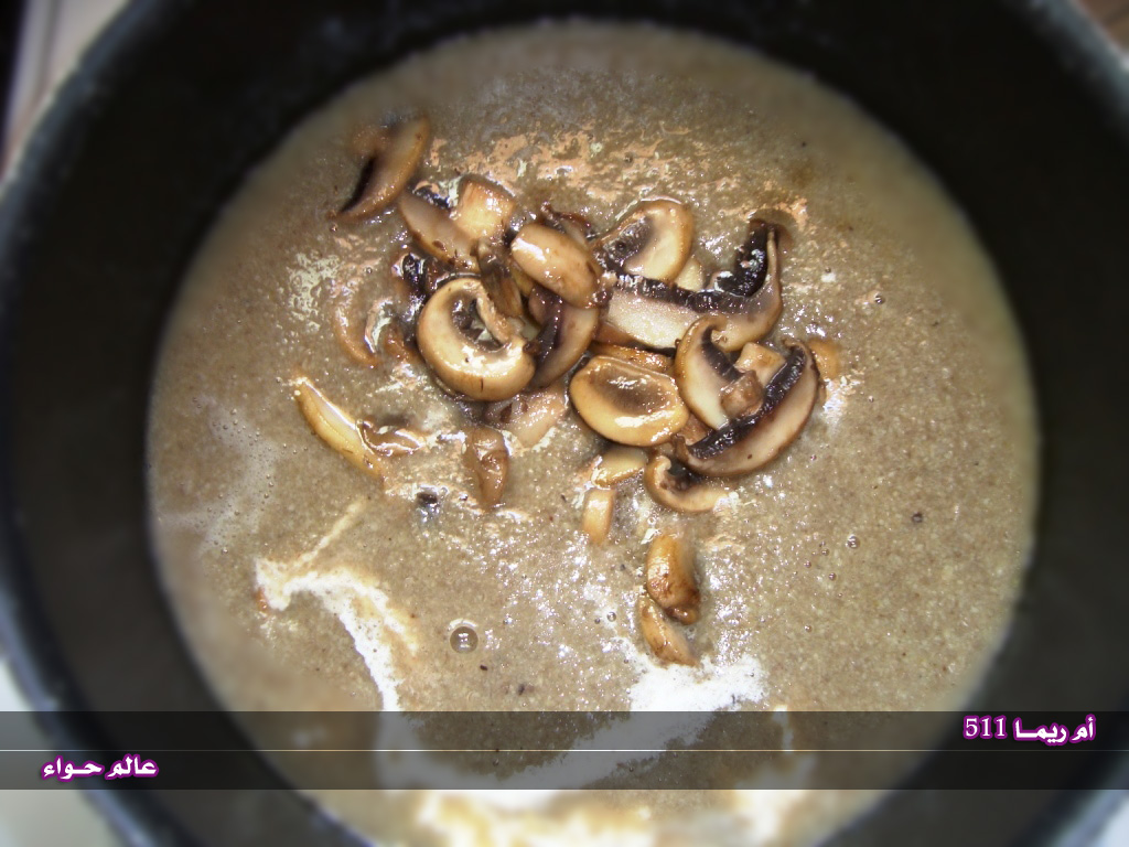 نضيف للشوربه ملح وفلفل اسود ونص حبه ماجي .. ثم نخلطهم بالخلاط ونرجعهم للنار ونحط عليهم الفطر المحموس